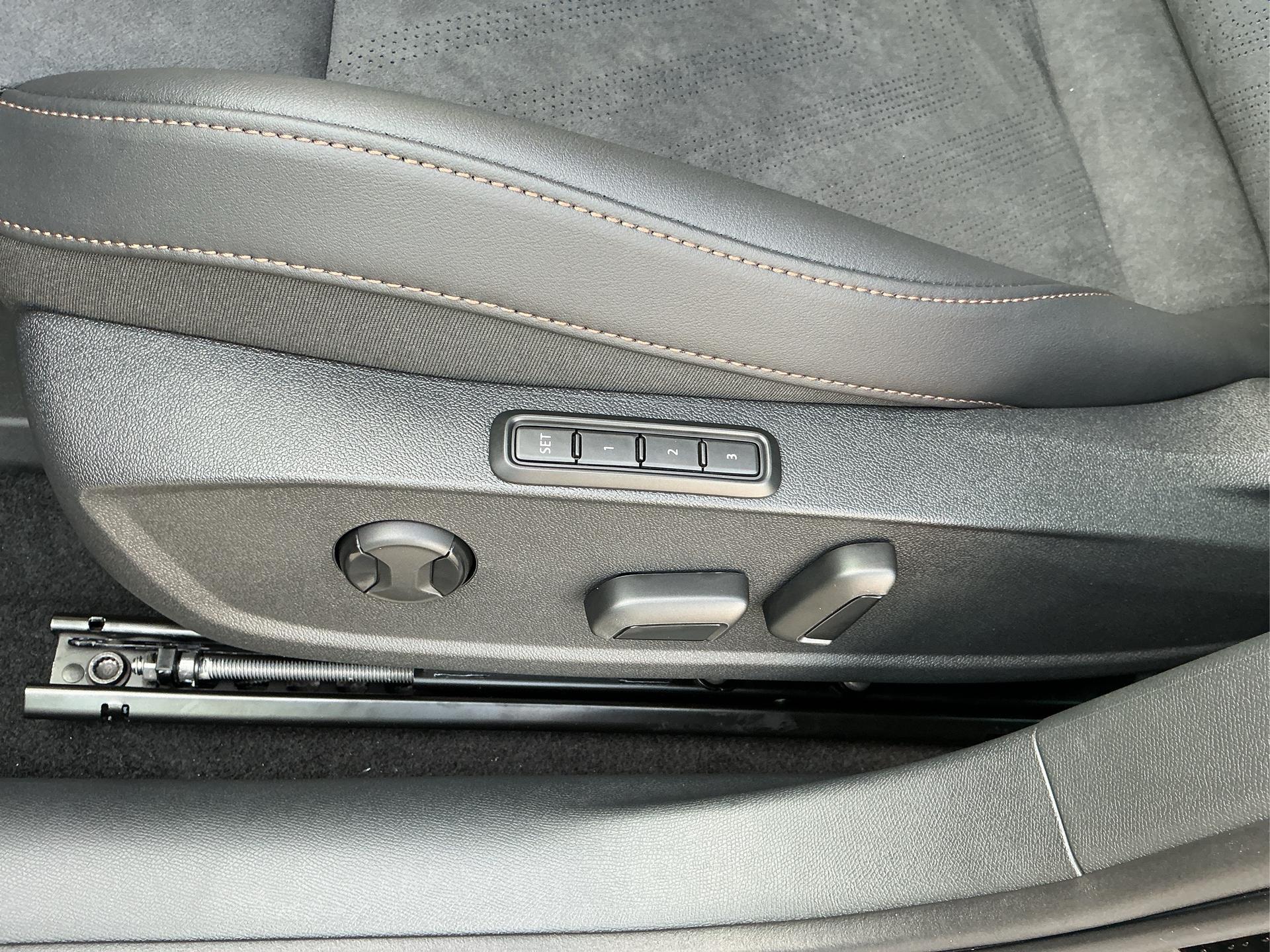 Dynamic Design Paket: Sportsitze mit in den Sitz integrierter Kopfstütze mit Dinamica-Polsterung in Soul-Schwarz mit blauen Akzenten, Elektrischer Fahrersitz mit Memory-Funktion und elektrischer Lendenwirbelstütze, Einstiegsleisten, Außenspiegel mit Memory-Funktion
